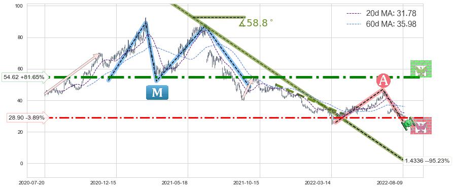 ♘ 阻力价格位54.62,可信任强度92.53%,距离最后交易2022-08-12形成的收盘价格30.07相差 +81.65%