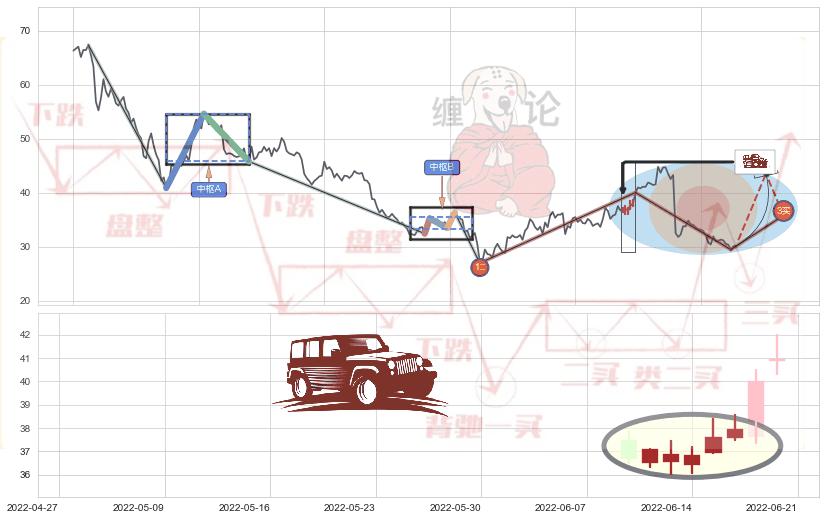 ➣ 【中枢B】:2022-02-11-2022-03-01,中枢由4笔构成,共13交易日, ZG=35.20, ZD=33.45
