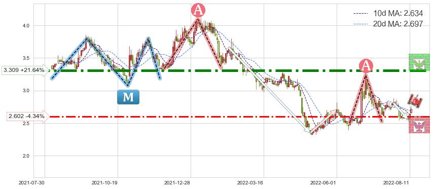 ♘ 阻力价格位3.309,可信任强度95.85%,距离最后交易2022-08-12形成的收盘价格2.720相差 +21.64%