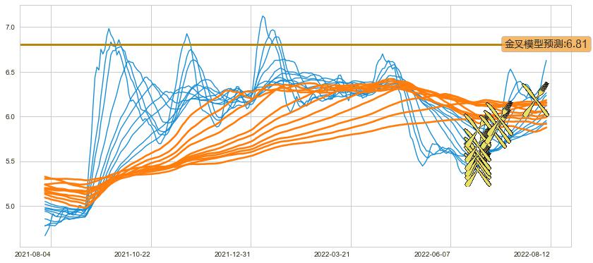 ➢ 10小时均线于(2022-08-04: 6.18)形成【金叉】基于【金叉历史模型】预测金叉后最高波峰价格: 6.84, 金叉后最高价格6.67,尚未达到预测最高波峰价格, 预期继续上涨