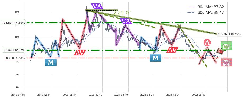 ♘ 阻力价格位98.96,可信任强度89.00%,距离最后交易2022-08-12形成的收盘价格88.07相差 +12.37%