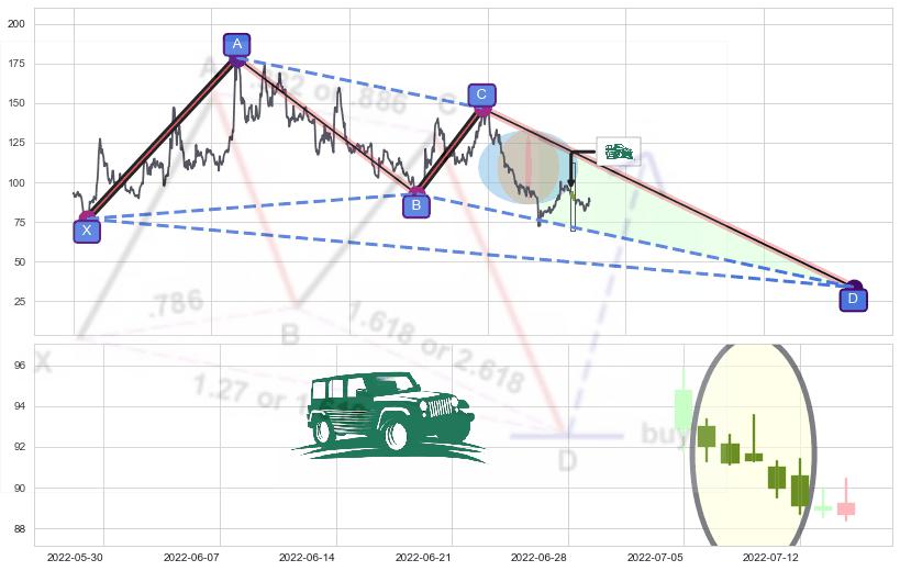 ➢ 谐波蝴蝶:b上拉接近c:猜想阻力性下沉 → 下跌 →【拐点】阻力临近 → 大趋势均值回复