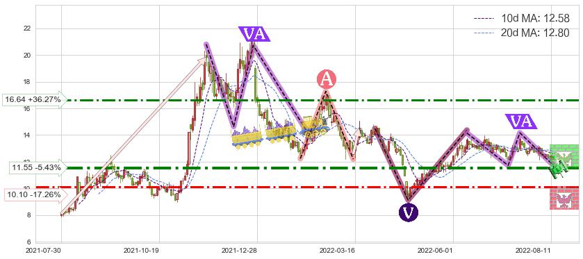 ♘ 阻力价格位11.55,可信任强度73.89%,距离最后交易2022-08-12形成的收盘价格12.21相差 -5.43%