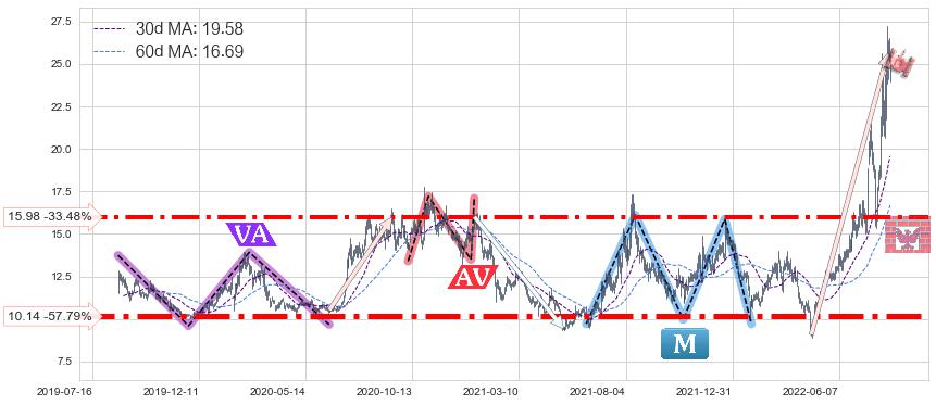 ♘ 支撑价格位15.98,可信任强度72.89%,距离最后交易2022-08-12形成的收盘价格24.03相差 -33.48%