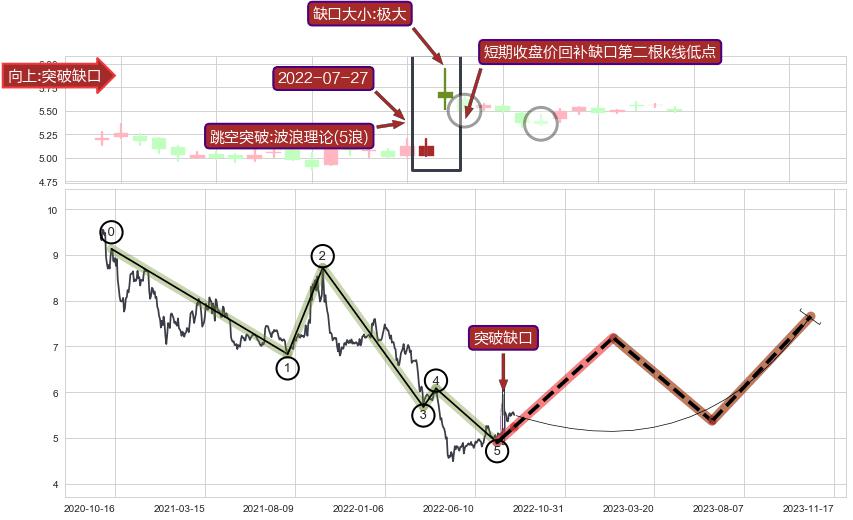 ➢ 突破缺口形成后,后续k已经超过7根,跳空突破波浪理论(5浪)关键点后, 出现【中度回踩】迹象,短期收盘价回补缺口第二根k线低点