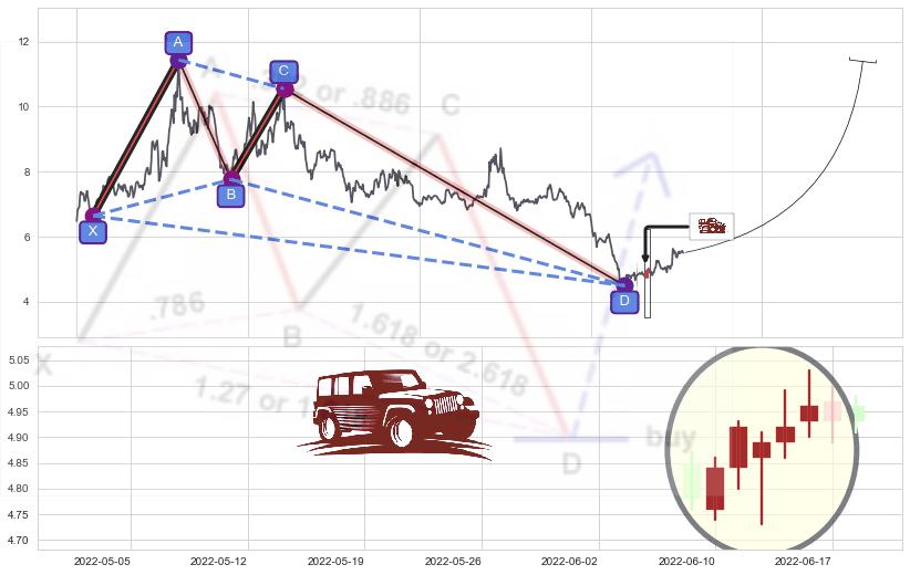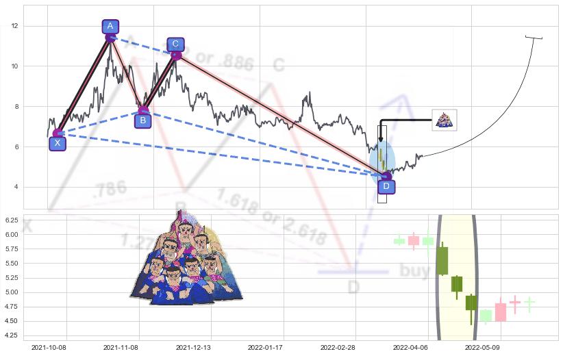 ➣ 谐波蝴蝶:c下跌到达d:猜想拉升 → 上涨 →【拐点】强支撑临近 → 大趋势均值回复