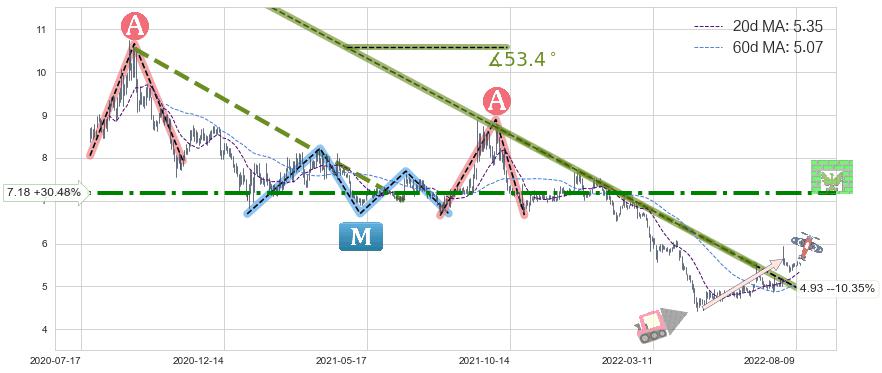 ♘ 阻力价格位7.18,可信任强度77.31%,距离最后交易2022-08-12形成的收盘价格5.50相差 +30.48%