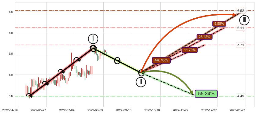 ➣ 循环浪继续向上【平均值】位置(2023-01-04, 6.11),匹配聚类样本比例52.33%, 可能性概率23.42%
