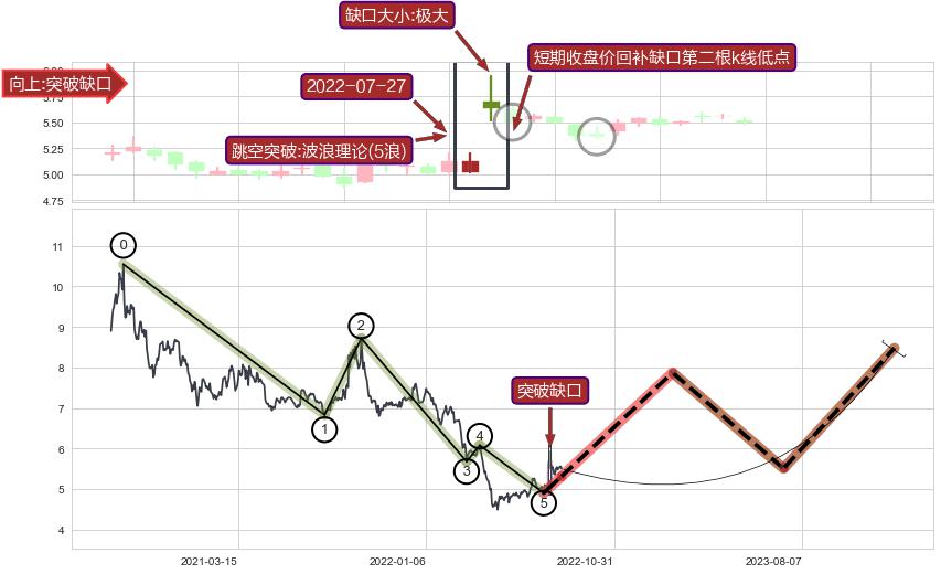 ➣ 突破缺口形成后,后续k已经超过7根,跳空突破波浪理论(5浪)关键点后, 出现【中度回踩】迹象,短期收盘价回补缺口第二根k线低点