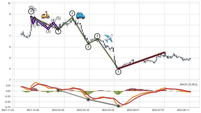 ➣ 波浪理论:猜想达到c点后小反弹终止反转下跌 → 下跌 → 【拐点】临近 → 阶段均值回复结束后继续大周期趋势跟踪