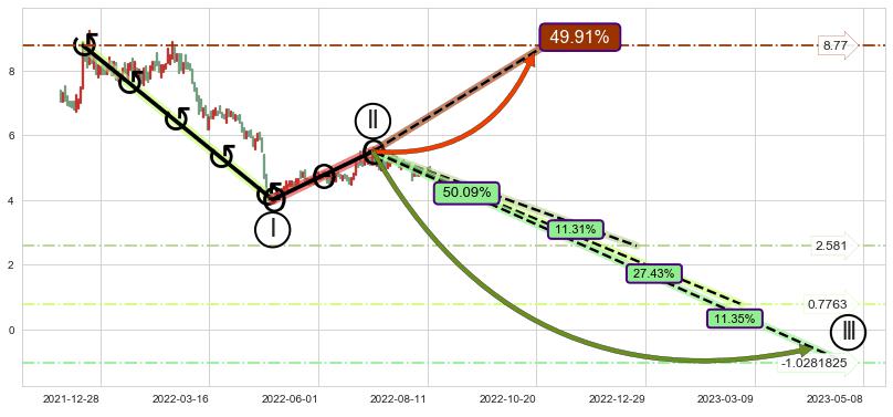 ➣ 循环浪继续向下【平均值】位置(2023-03-01, 0.7763),匹配聚类样本比例54.75%, 可能性概率27.43%