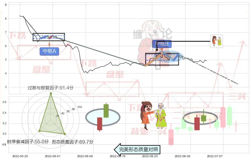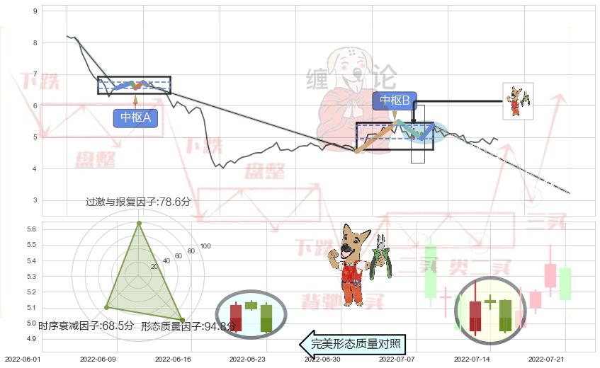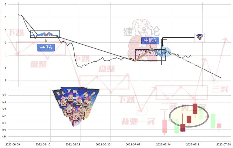 ➣ 【中枢B】:2022-06-22-2022-07-20,中枢由4笔构成,共21交易日, ZG=5.38, ZD=4.95