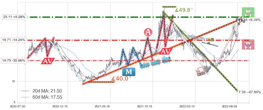 ➢ 【仅预测突破】最后价格:22.98与预测突破价格:21.70→【空间中等】后续最小【整理】第一目标价格→(2022-10-20: 7.75 )