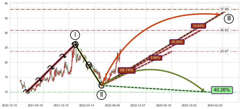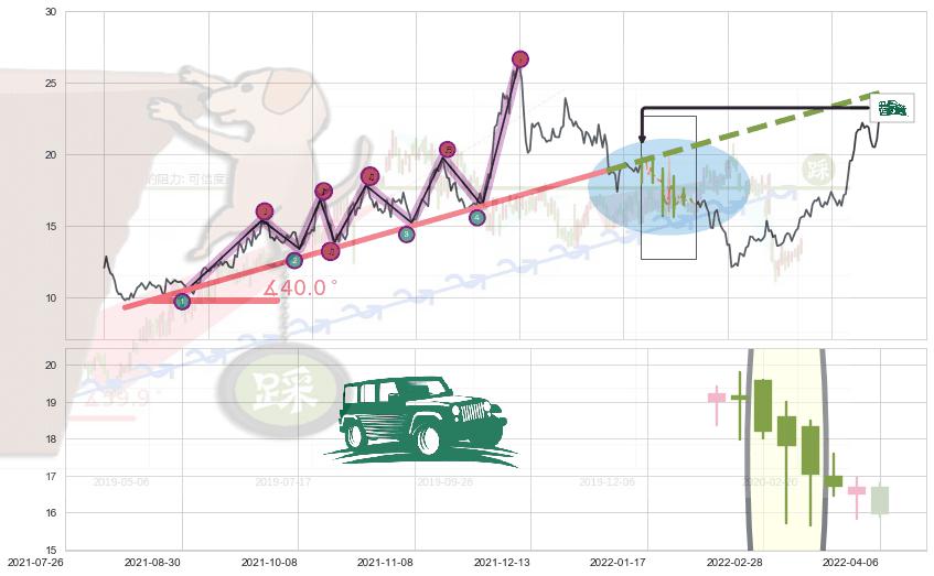♘ 支撑价格位14.79,可信任强度53.70%,距离最后交易2022-08-12形成的收盘价格22.98相差 -35.66%