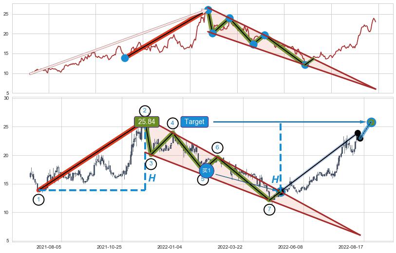 ➣ 最小中继整理跌幅→𝐇: 13.95 (𝐇旗杆的长度:旗杆起点→顶点)