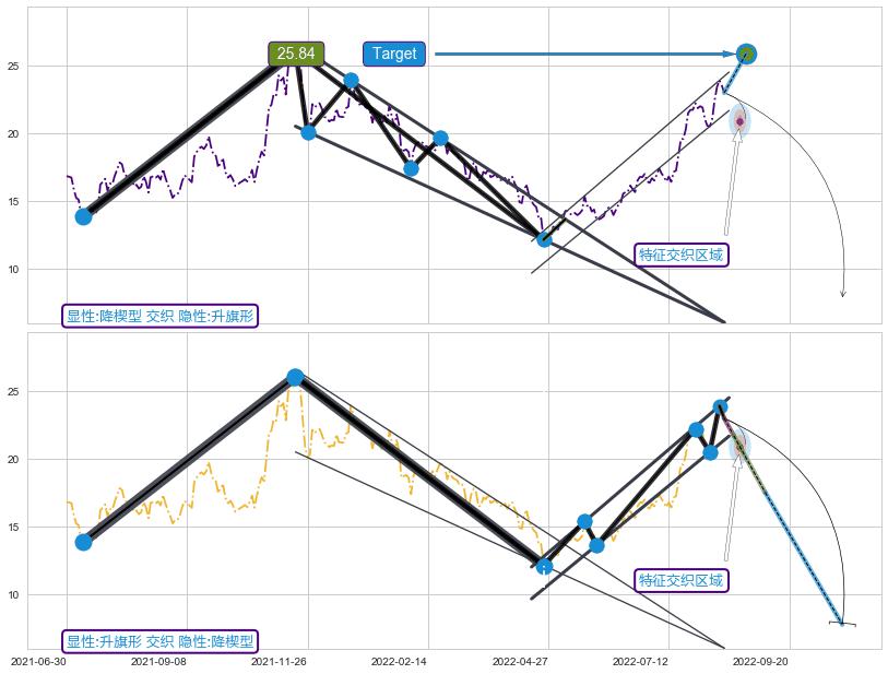 ➢ 降楔型:猜想预期上涨目标target即将达成,随后猜想强阻力来临,预期回调下跌(均值回复)