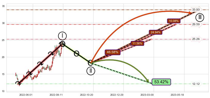 ♘ 支撑价格位15.77,可信任强度88.43%,距离最后交易2022-08-12形成的收盘价格22.98相差 -31.39%