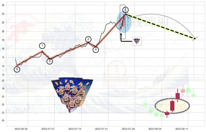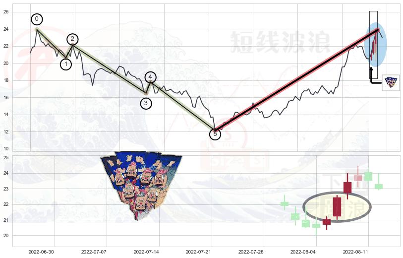 ➣ 看跌(高位倒锤头)流星线 + 波浪理论上涨浪:浪5回调拐点信号叠加后【反向回撤率】高,【看空】信号叠加【存续影响小】