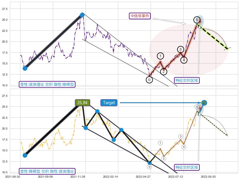 ➢ 波浪理论与降楔型信号事件周期长度级别相同,同周期信号事件