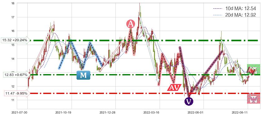 ♘ 阻力价格位15.32,可信任强度94.45%,距离最后交易2022-08-12形成的收盘价格12.74相差 +20.24%