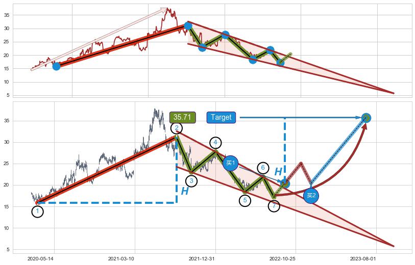 ➢ 降楔型:猜想临近关键阻力位突破点 → 临近拐点上涨 → 机会信号 → 大趋势均值回复