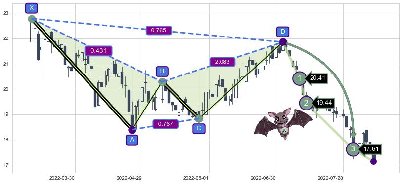 ➣ 已完成【蝙蝠】形态起点X: 2022-03-11, 终点D: 2022-07-04, 共76交易日
