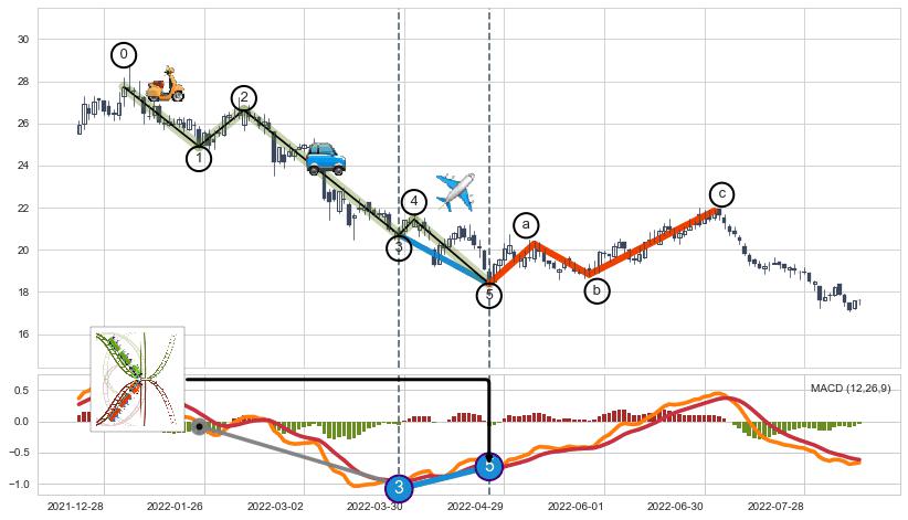 ➣ 波浪理论:猜想达到c点后小反弹终止反转下跌 → 下跌 → 【拐点】临近 → 阶段均值回复结束后继续大周期趋势跟踪