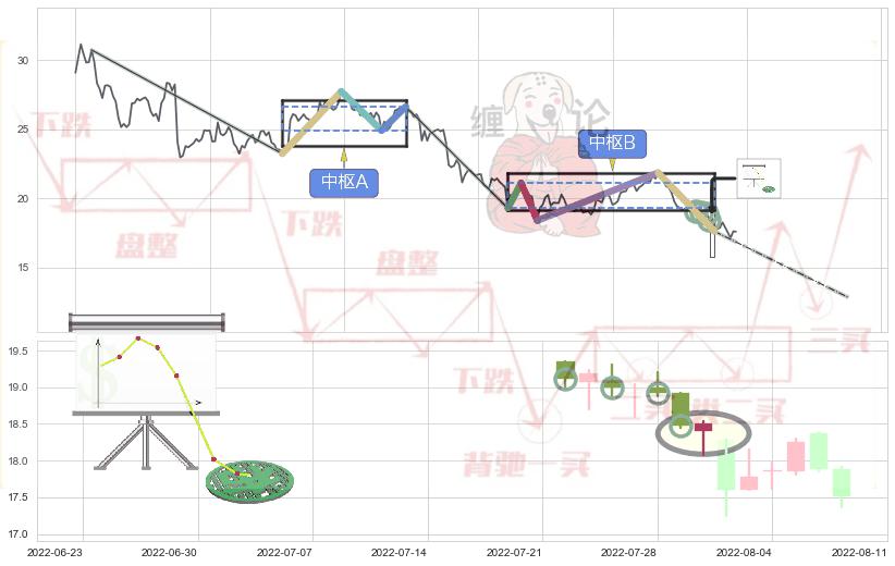 ➣ 【中枢B】:2022-04-11-2022-08-02,中枢由5笔构成,共78交易日, ZG=21.11, ZD=19.29