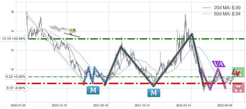 ♘ 支撑价格位8.57,可信任强度97.40%,距离最后交易2022-08-12形成的收盘价格9.20相差 -6.90%