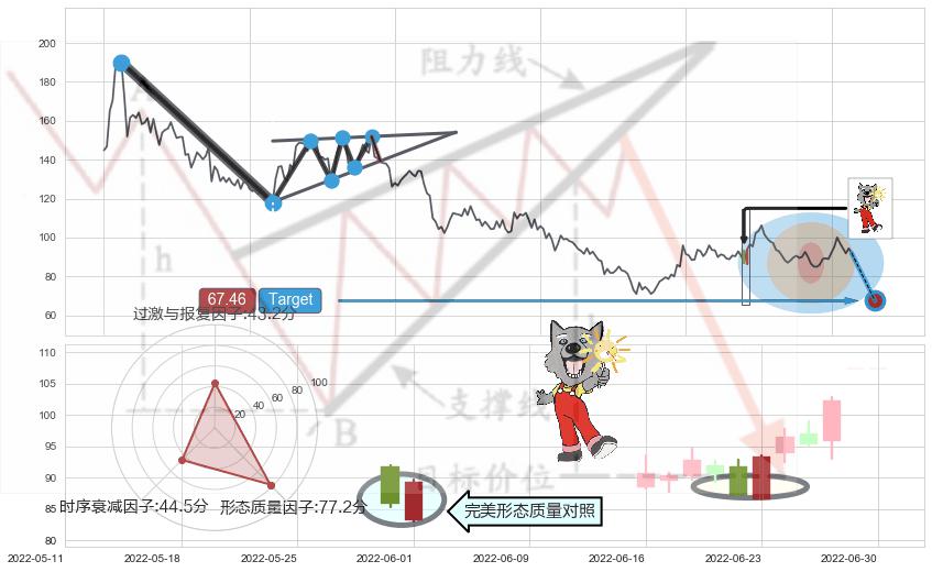 从2021-07-30至2022-05-20,共包含193个交易日,阶段股价下跌-67.76%,阶段股价变动位移路程比: 1 : 7,下跌趋势角度: 55.0