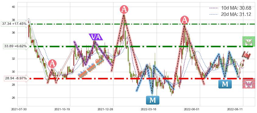 ♘ 阻力价格位33.89,可信任强度90.48%,距离最后交易2022-08-12形成的收盘价格31.79相差 +6.62%