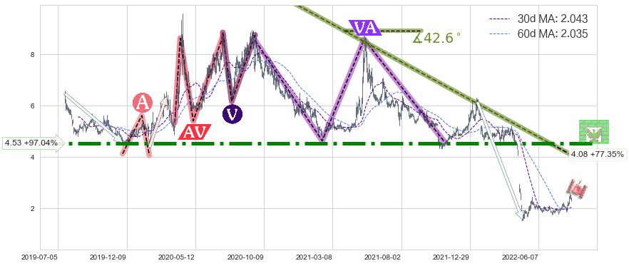 ♘ 阻力价格位4.53,可信任强度85.38%,距离最后交易2022-08-12形成的收盘价格2.300相差 +97.04%