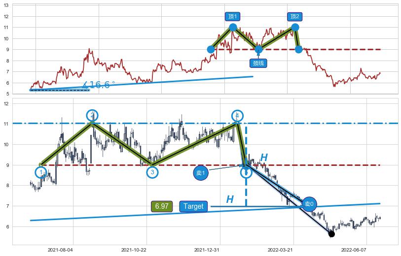 ➢ 【卖1】: 激进型 卖点→(2022-01-27: 9.00 )形成突破双重顶【反转】形态