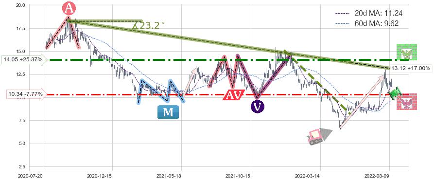 ♘ 阻力价格位14.05,可信任强度72.74%,距离最后交易2022-08-12形成的收盘价格11.21相差 +25.37%