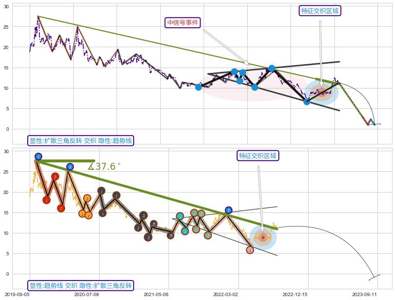 ➣ 下跌螺旋桨 + 扩散三角反转临近支撑猜想转换阻力下跌信号叠加后【目标达成率】低,【看空】信号叠加【存续影响大】