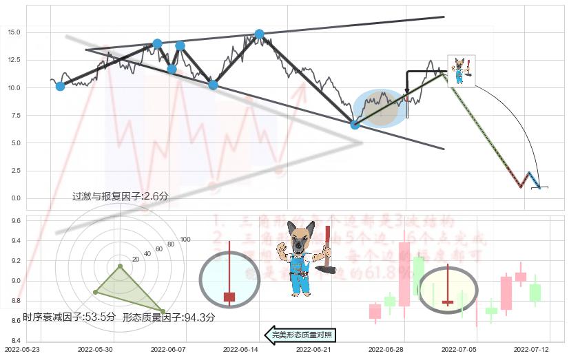 ➢ 阴包阳形态 🔜 扩散三角反转临近支撑猜想转换阻力下跌 综合量化分数:47.41 【中性】