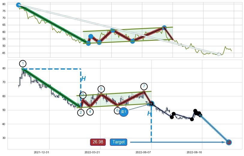 ➣ 最小中继整理跌幅→𝐇: 27.63 (𝐇旗杆的长度:旗杆起点→顶点)