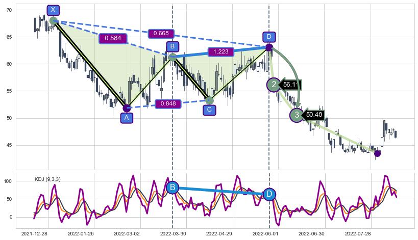 ➢ 谐波价格D点比B点高 ⤴,【KDJ】指标D点比B点低 ⤵️