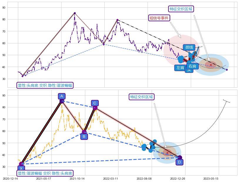 ➢ 头肩底属【短级别信号事件】谐波蝙蝠属【长级别信号事件】长短周期组合信号事件, 短长事件长度比14.18%