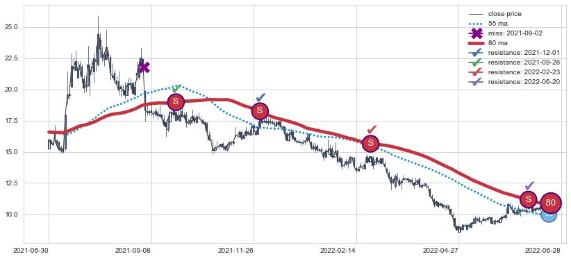 ➢ 最优均线组合共正确确认支撑阻力信号7处,正确确认率 77.78%