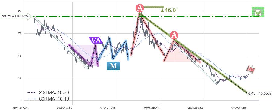 ♘ 阻力价格位23.73,可信任强度74.13%,距离最后交易2022-08-12形成的收盘价格10.85相差 +118.70%
