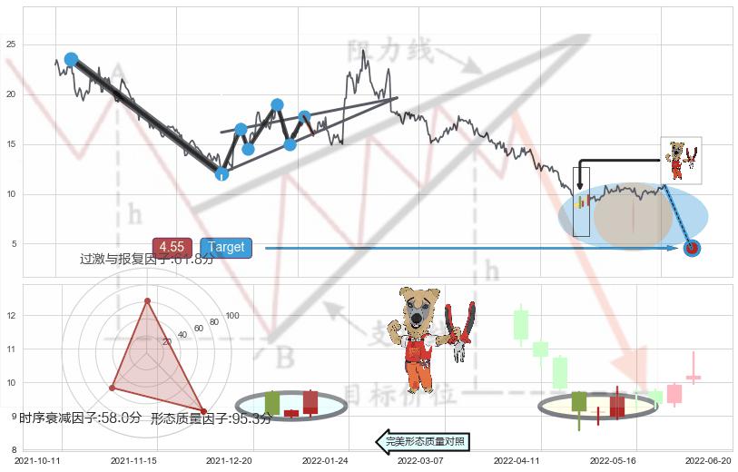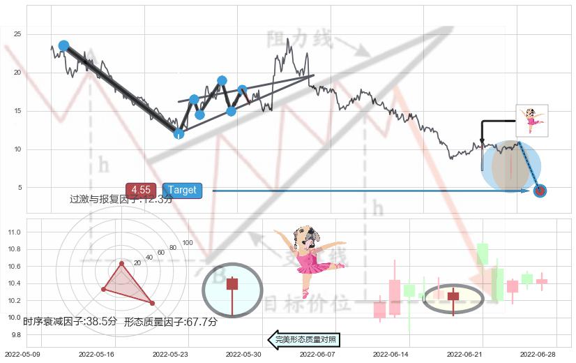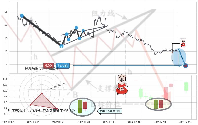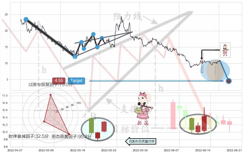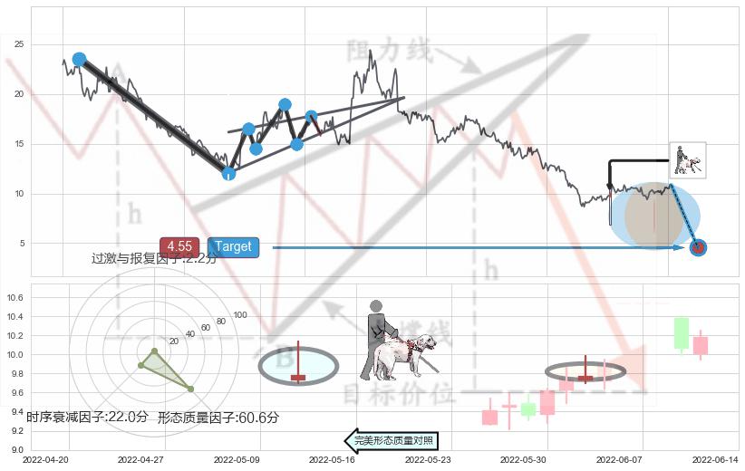 从2021-08-03至2022-06-17,共包含210个交易日,阶段股价下跌-77.90%,阶段股价变动位移路程比: 1 : 5,下跌趋势角度: 46.0