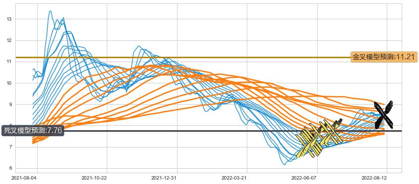 ➢ 10小时均线于(2022-08-11: 8.51)形成【死叉】基于【死叉历史模型】预测死叉后最低波谷价格: 8.08, 死叉后最低价格8.34,尚未达到预测最低波谷价格, 预期继续下跌