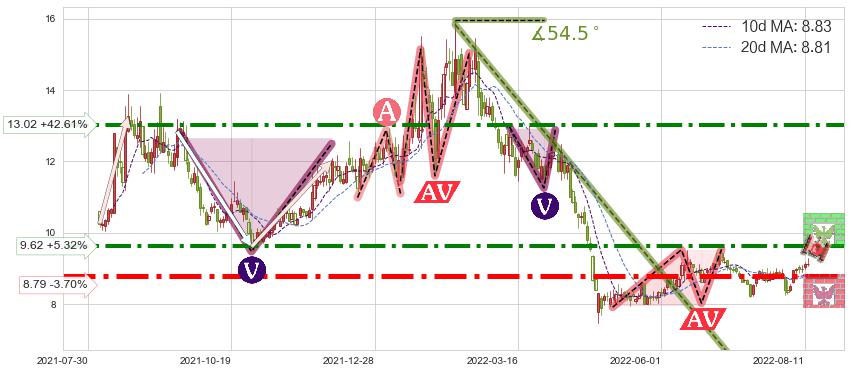 ♘ 阻力价格位9.62,可信任强度78.16%,距离最后交易2022-08-12形成的收盘价格9.13相差 +5.32%