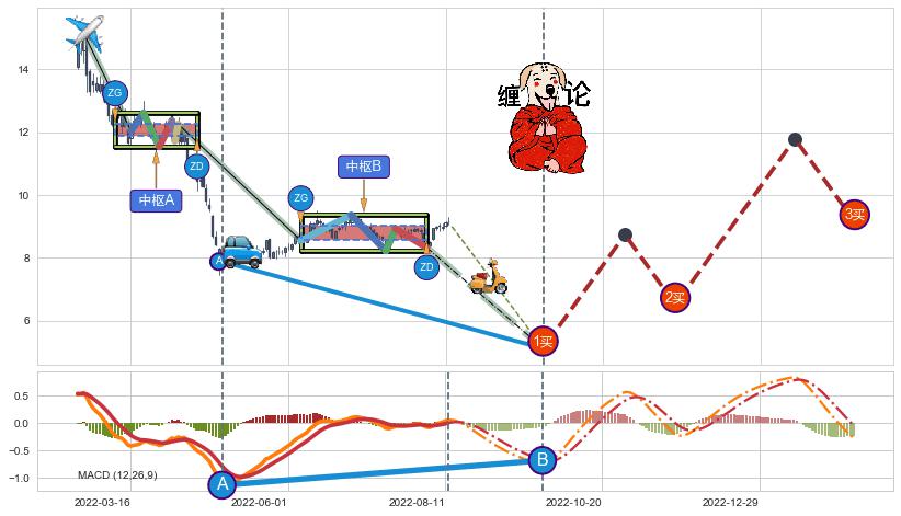 ➢ 【中枢A】:2022-03-16-2022-04-08,中枢由6笔构成,共16交易日, ZG=12.26, ZD=12.05