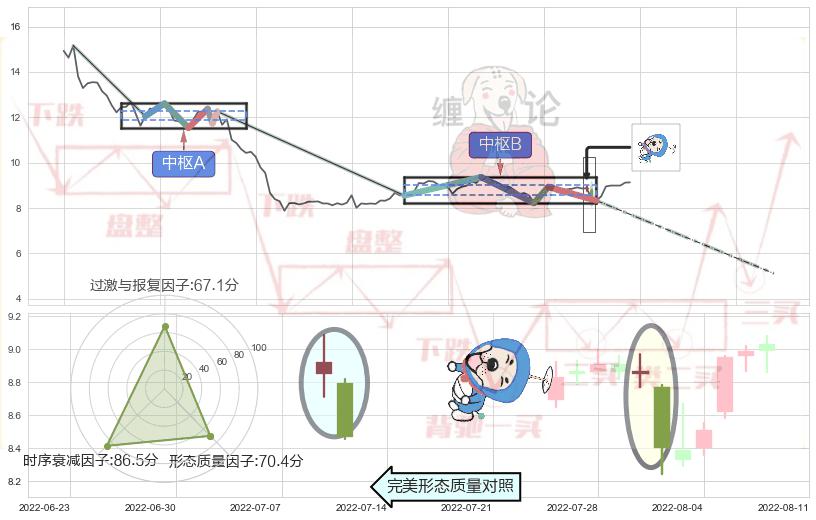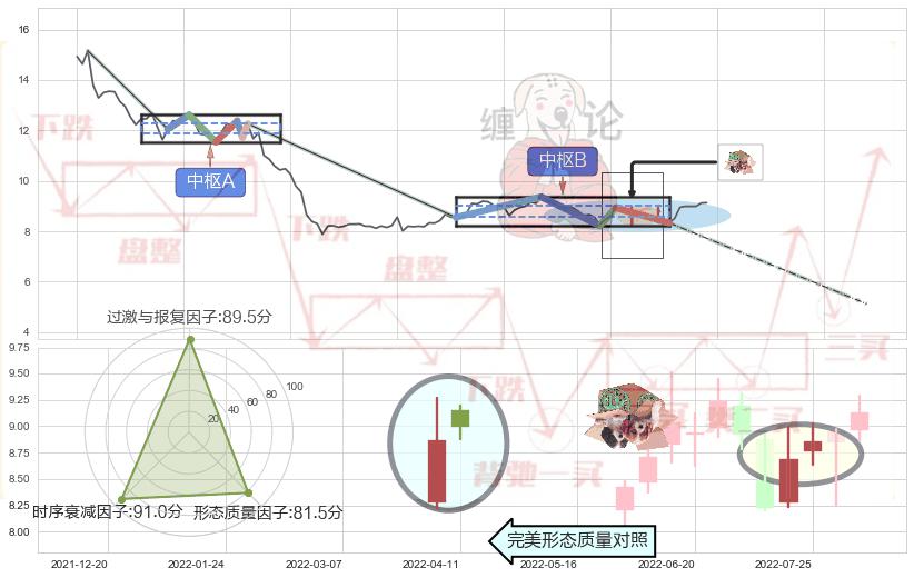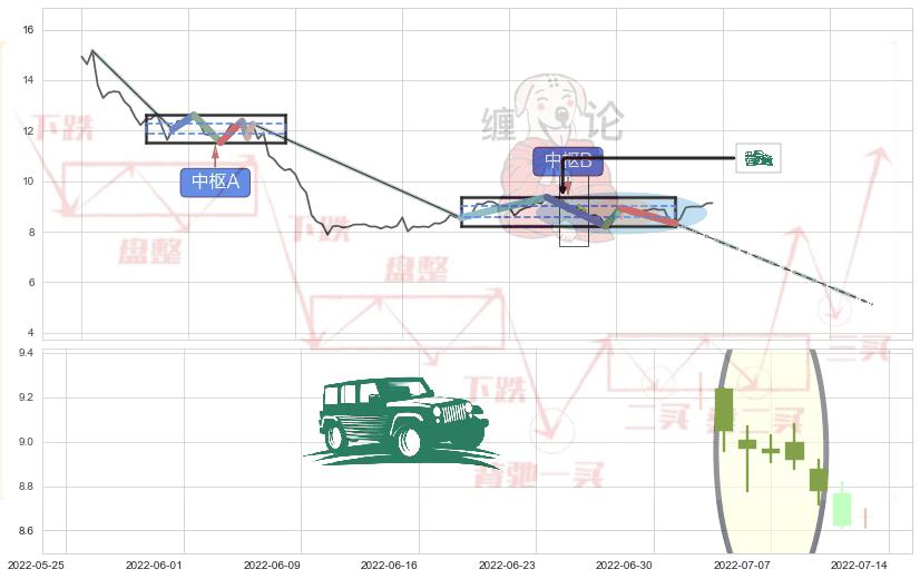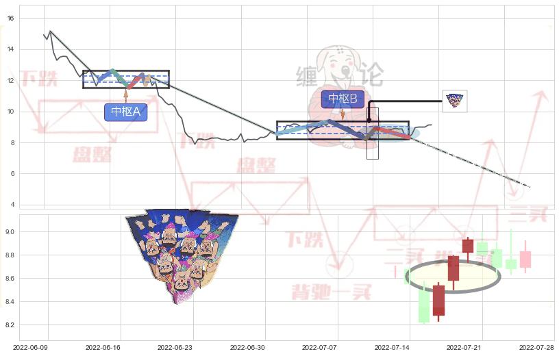 ➣ 【中枢B】:2022-06-08-2022-08-03,中枢由5笔构成,共41交易日, ZG=8.93, ZD=8.55