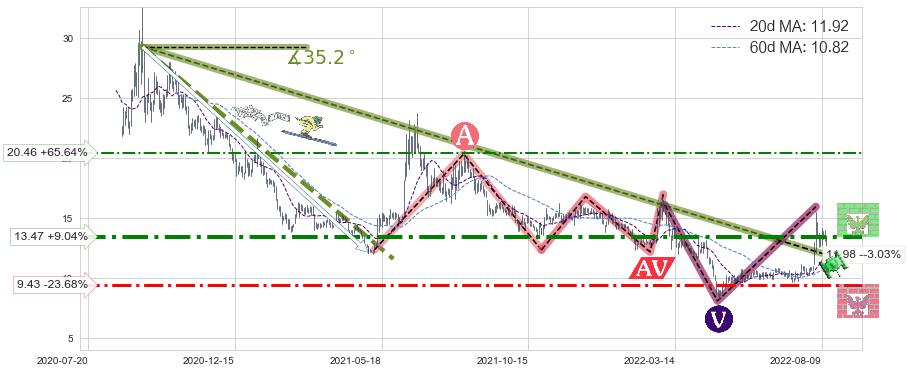 ♘ 阻力价格位13.47,可信任强度79.32%,距离最后交易2022-08-12形成的收盘价格12.35相差 +9.04%