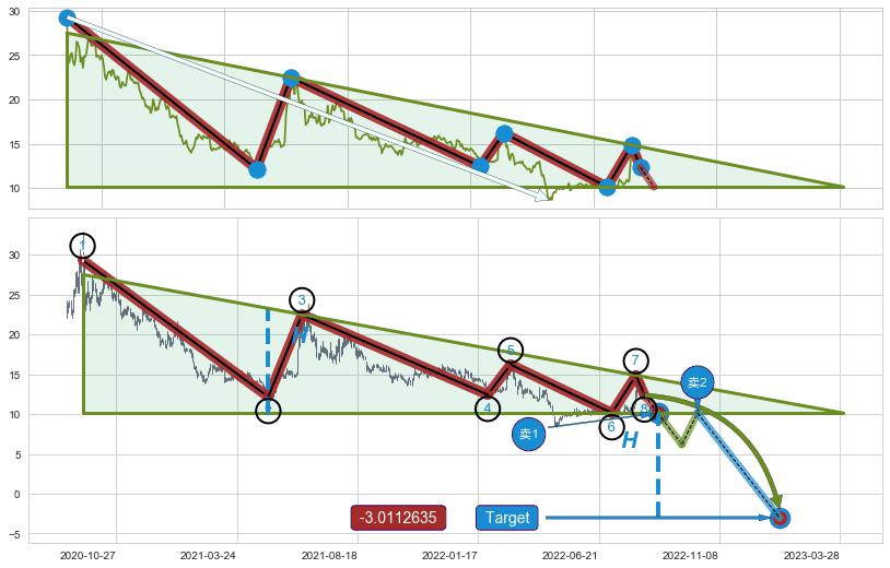 ➢ 下降三角整理:猜想临近关键支撑位突破点 → 临近拐点下跌 → 风险信号 → 大趋势均值回复