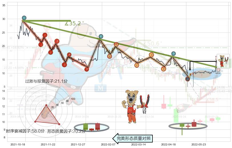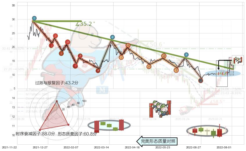 从2020-09-09至2022-06-27,共包含433个交易日,阶段股价下跌-76.44%,阶段股价变动位移路程比: 1 : 13,下跌趋势角度: 35.2