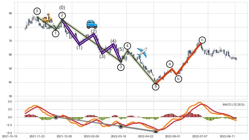➣ 波浪理论:猜想达到c点后小反弹终止反转下跌 → 下跌 → 【拐点】临近 → 阶段均值回复结束后继续大周期趋势跟踪